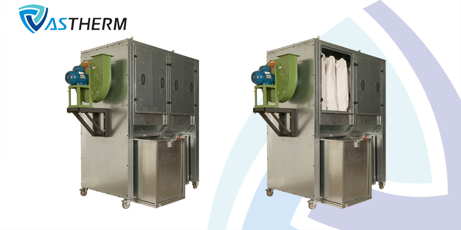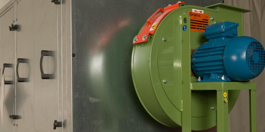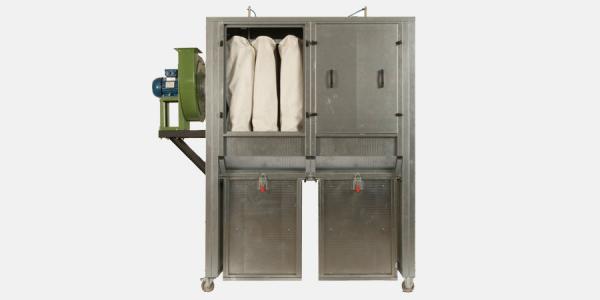 Posiada automatycznie otrzepywane filtry patronowe i zbiorniki pyłu. Układ można rozbudować modułowo. Poniżej - wentylator wyciągu i widok boczny całego urządzenia.