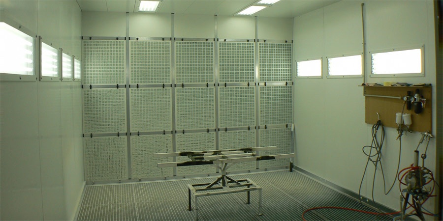 Jak zwykle w lakierni istotnym czynnikiem jest jasność i rozmieszczenie oświetlenia. W zależności od profilu produkcji proponujemy różne warianty: lampy pionowe, lampy poziome, również w dwóch i więcej rzędach, lampy poziome + lampy w suficie świecące do dołu. Podobnie jak w przypadku sposobu wentylacji, tu również uzgadniamy i proponujemy najwłaściwsze rozwiązanie, zależne od specyfiki produkcji.